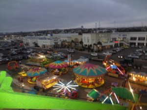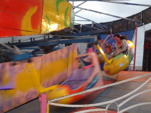 Solo unas muchachas en otra canasta y nosotros estábamos en la Rueda de la Fortuna. Fatal se siente ok? Mi mas grande temor era que estas ferias las arman en un dia y luego me fije bien y el monstruoso juego estaba ‘balanceado’con unas tablas de maderas nada mas! Ya se me hacia que se soltaba la rueda y terminábamos rodando hacia la playa!